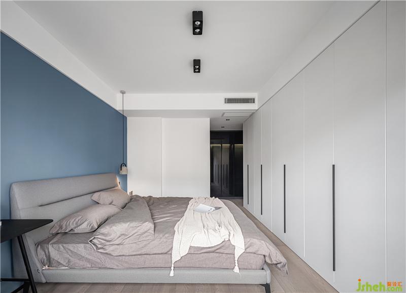 ▲整面收納空間集中在此,外觀仍以白色表述。通過外層的半透窗簾追溯光的源頭,再行至床頭處,梳妝臺和床枕在靜水流深的一面藍色中,柔光浮動,空間帶著淡意的暖色。