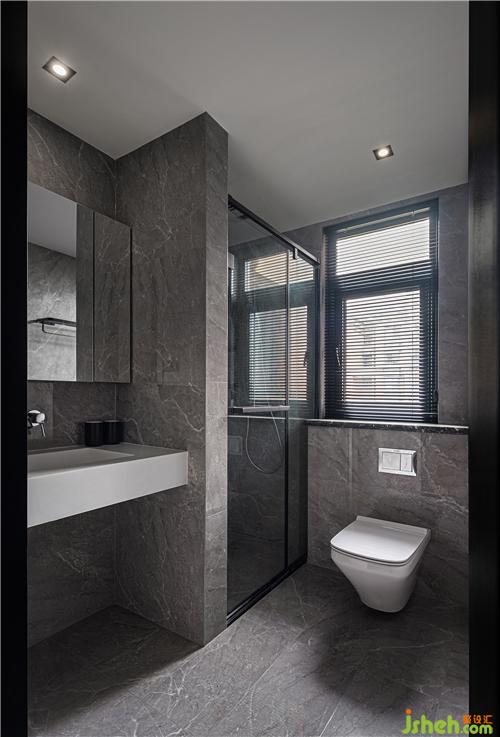 ▲客衛(wèi)空間相應擴寬,干濕區(qū)合并,利用新砌墻體的凹凸,使臺盆與淋浴區(qū)隔窄墻相鄰,墻排馬桶進一步節(jié)省空間,明確合理的將功能規(guī)劃齊全。