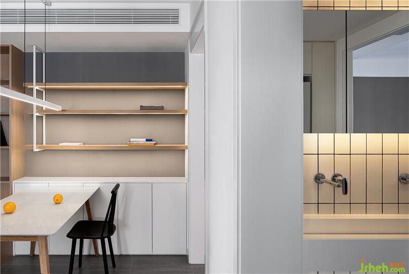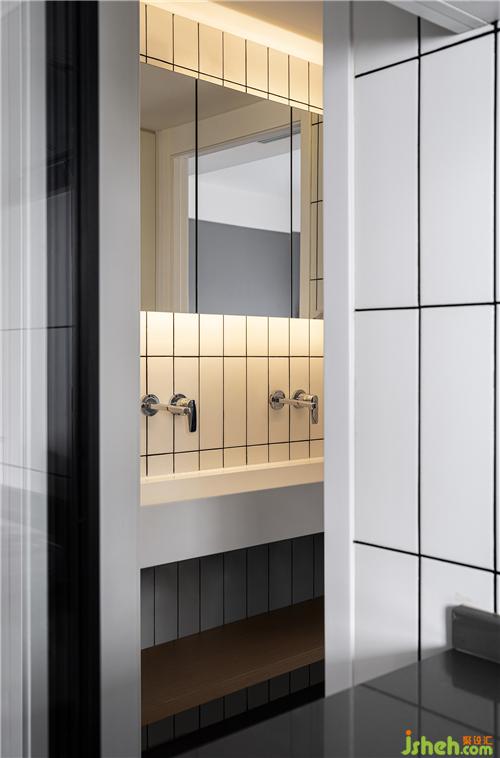 ▲裝修設計為了更貼近家中人口的需要,衛(wèi)生間功能做了干濕分割,干區(qū)獨立出來嵌入從主臥中分割出的路徑邊緣,距離餐廚、臥室都很近。亞克力一體式臺盆,用足夠的長度補充被壓縮的寬度,適合多人同時使用。