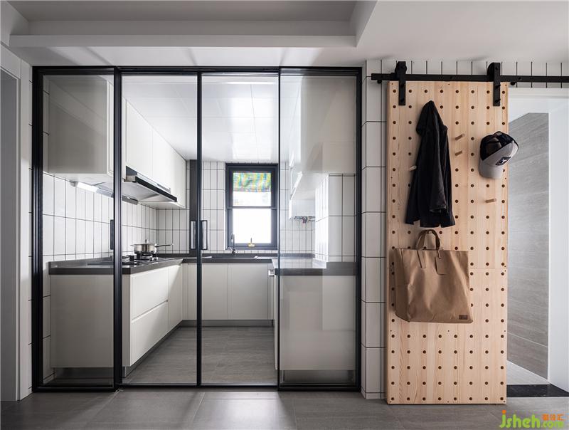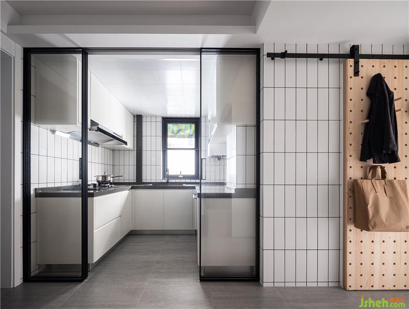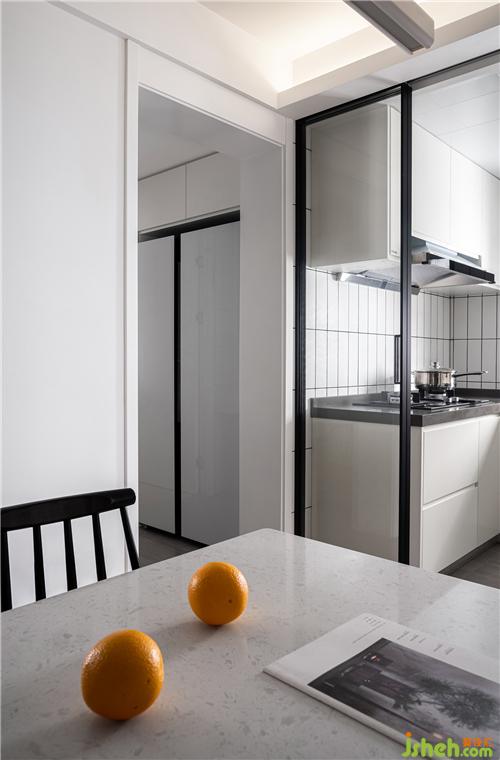 ▲餐廚同享一個空間,玻璃移門拉開一條透明的界限,為沒有窗戶的餐廳引入自然光。冰箱被嵌入通往主臥的走道邊緣,留給廚房足夠的空間擴展出最實用的u型櫥柜、雙側吊柜。
