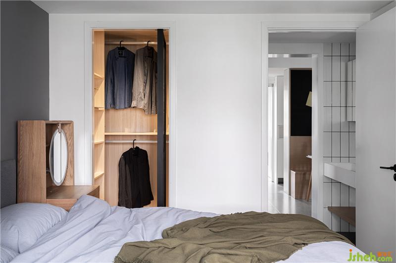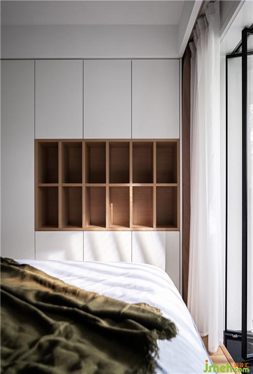 ▲從主臥的整面白色衣柜中破出兩層開放的小格,露出原木色內里,裝修設計在有限的空間內功能交織組合,實現(xiàn)形式被準備的更多樣,光斜著灑落,個人主義渺小而溫暖,卻是有關家的具象表達。