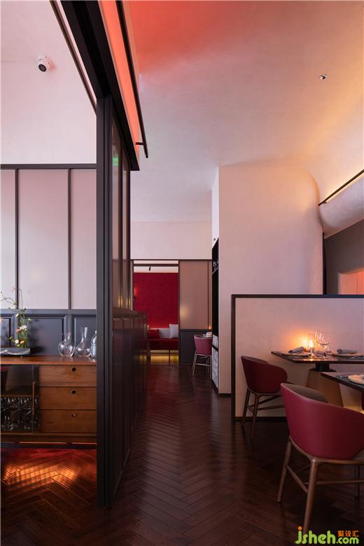 拱券式天花在頭頂扭力交疊,與有機(jī)三曲面定義出雕塑感空間外殼,柔軟的動感在強有力的材料扭結(jié)中滲透出來。餐廳設(shè)計向內(nèi)經(jīng)過旋扭折疊,視野豁然、場景轉(zhuǎn)換,抵達(dá)帶有古典意向和東方觸感的餐區(qū)。多組場景在內(nèi)部拼貼,緊湊卻保持一份疏離感。玻璃幕墻與隔斷移門對空間進(jìn)行蒙太奇式的分隔連接,城市隨機(jī)性與陌生激發(fā)的歸屬感暗含在動線邏輯中??臻g環(huán)游中,無拘束的親切穩(wěn)妥將逐步瓦解對法餐高調(diào)繁復(fù)的刻板印象。