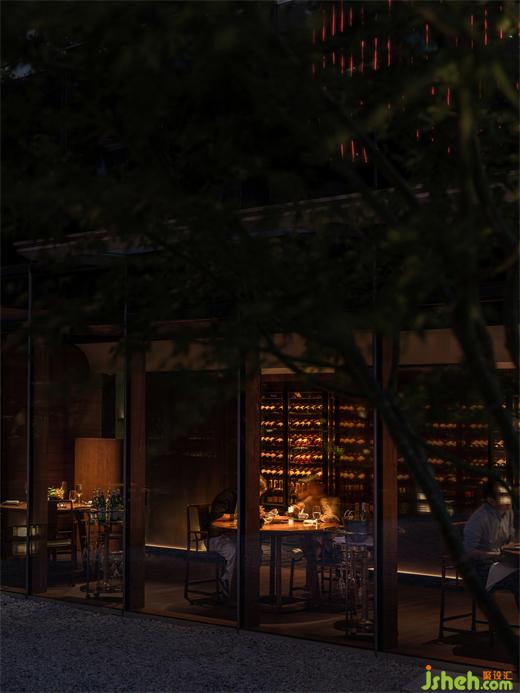 從不同角度看,庭院與餐廳互為內(nèi)外又彼此共融,庭院不過分營造,內(nèi)部不刻意炫技,旗鼓相當(dāng)而激發(fā)出大力道,借勢大江河,餐廳設(shè)計(jì)兼具內(nèi)斂與疏闊。