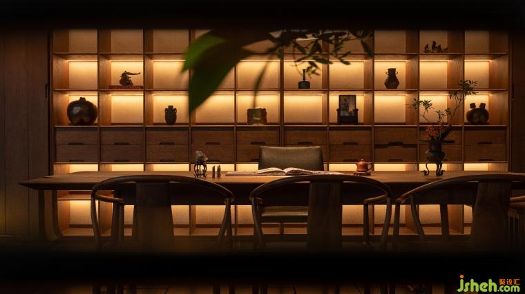 提籃陳列柜提示著一個(gè)不容薄待的大徽州,透過(guò)格柵,茶室在環(huán)游的盡頭靜待來(lái)客。