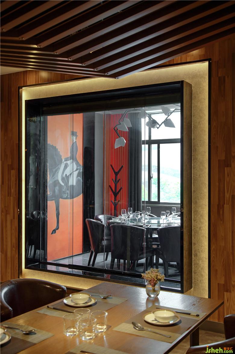 通過鏡面效果將整個(gè)空間置于一種無限延伸的錯(cuò)覺當(dāng)中。舞臺(tái)正對(duì)面的三個(gè)包間通過透明玻璃與大廳相融合,特定情況下既能保證體驗(yàn)者的私密性,又能讓包間里的用戶感受到大廳里駐唱歌手所帶來的現(xiàn)場(chǎng)感官體驗(yàn)。
