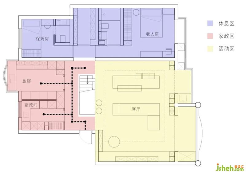 樓梯轉角,進入公共起居室,早、晚的活動在此進行,避免打擾老人休息。