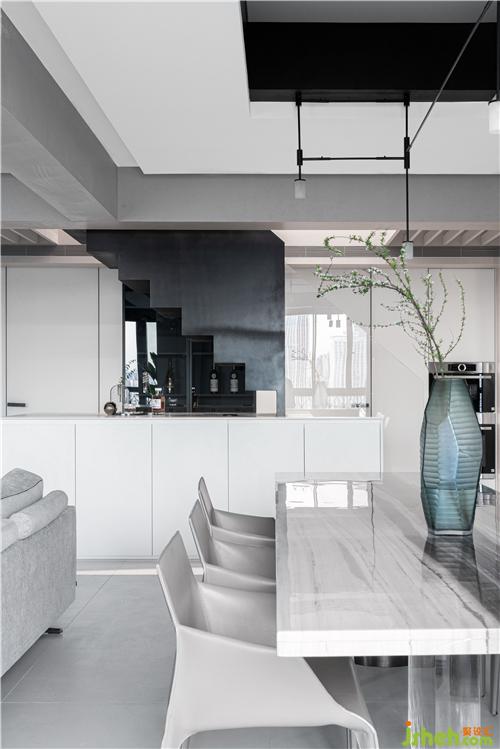 西廚島臺緊貼樓梯,既是客廳與廚房之間的隔斷,又能在準備美食時與客人互動。島臺背后,在廚房與家政間之間打造了整面酒柜,裝點了都市人的生活。