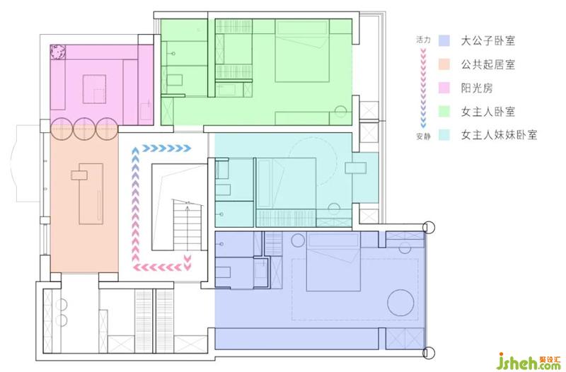 拾級而上,來到二層空間。從二層樓梯口開始,空間沿順時針排布,功能由動到靜依次展開。