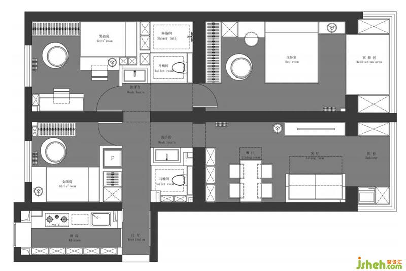2、將原有衛(wèi)生間分隔成2個獨立馬桶間并另設(shè)獨立淋浴間,做到干濕分離且滿足一家四口生活起居需求。