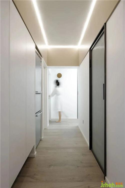 玄關(guān)是入戶后的第一景,但這個房子原始布局的進門過道略顯狹長,上方還有兩條低矮的梁頂,給人造成一種視覺壓抑。