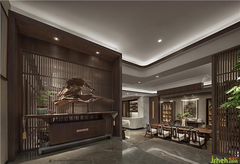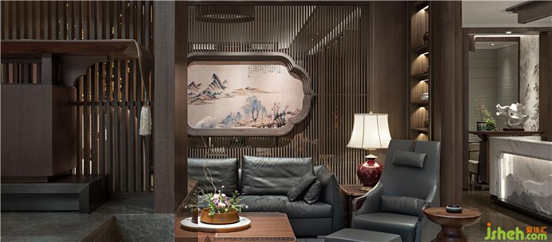 素雅的色調(diào),樸拙的物件,一巨幅山水畫懸掛于廳堂,形成了古色古香的靈妙意趣,木制鏤空的格柵背景在光線闌珊之間制造空間的變化,巧妙的設(shè)計(jì)中帶著對傳統(tǒng)文化精髓的美好追尋。地毯仿若一幅巨大的山水畫為整個(gè)空間的水墨意象定調(diào),與溫潤如玉的家具材質(zhì)相顯益彰,在柔和的光照中營造高雅與平和,為文人雅士帶來清雅怡然、寧靜超凡的空間意境,讓心脈的溝通距離再一次被拉近。會(huì)所設(shè)計(jì)