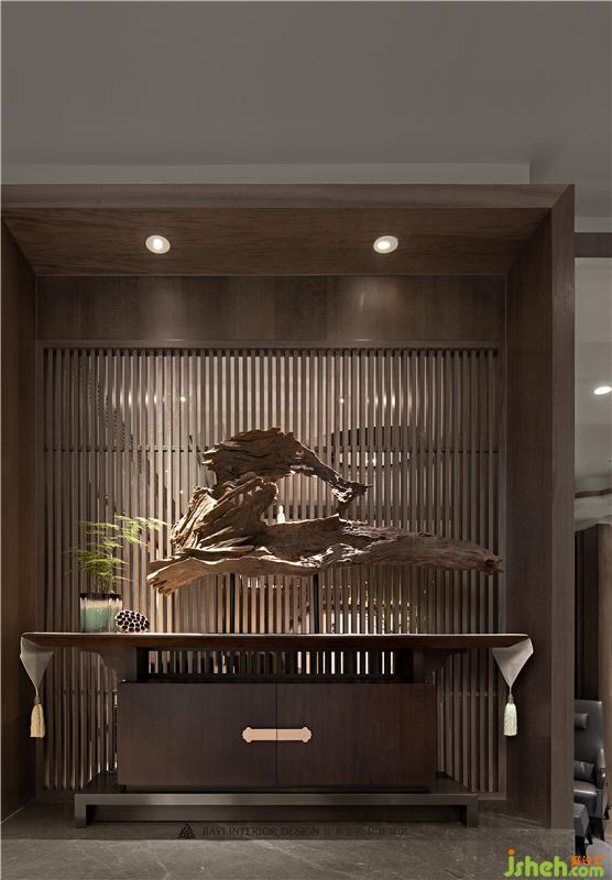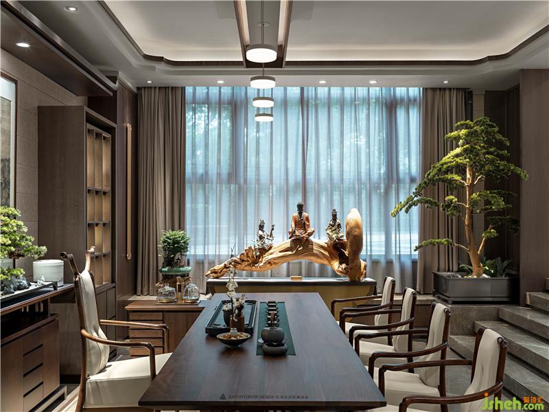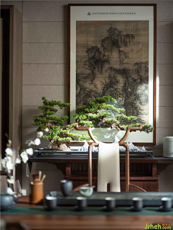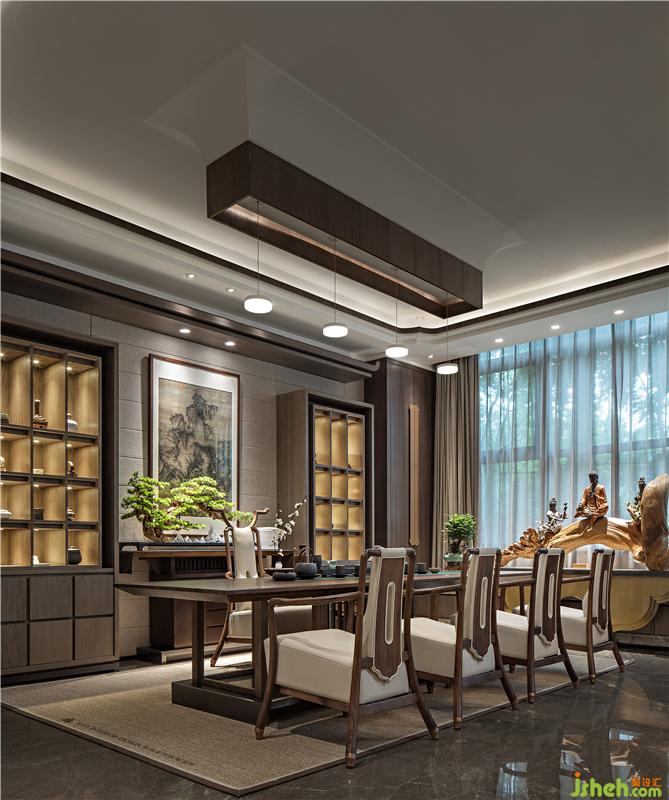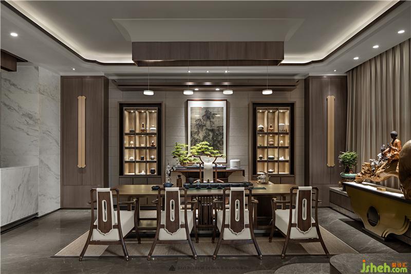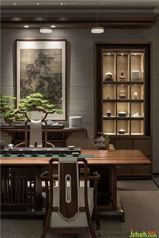 居者,禮待天下。宋式官帽椅坐立正中,儀態(tài)沉穩(wěn)端莊,副椅周圍環(huán)繞有序有章,彰顯貴賓禮遇。主椅背景左右對稱,有物有序,素雅不失高貴,一巨幅山水畫自上而下,為整個空間帶來大氣磅礴的氣勢。簾前白紗似透非透,以“空”攝“實”的朦朧里,燃一線香,沏壺好茶,架上藏納古物雅玩,談笑風(fēng)生看沉浮,閑情逸致存高遠,何其自在。會所設(shè)計