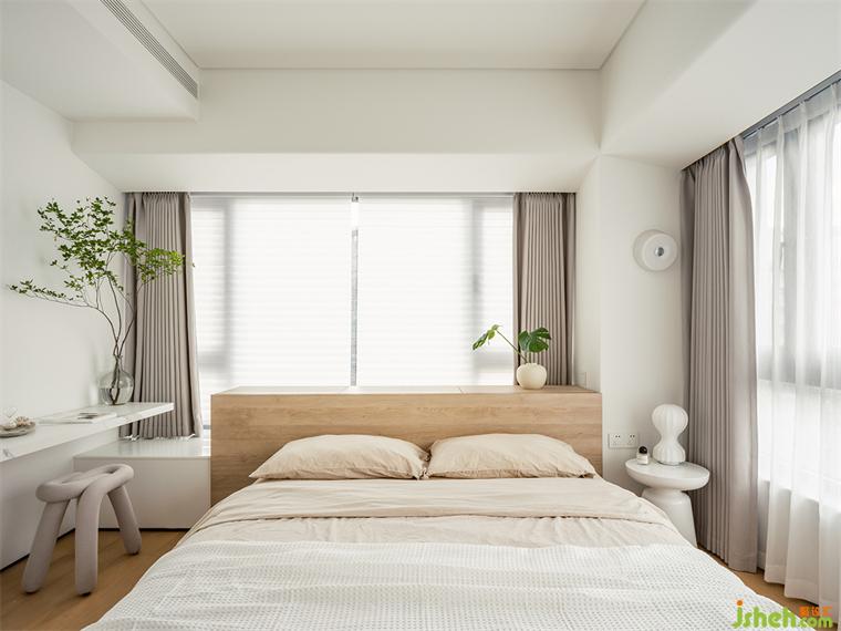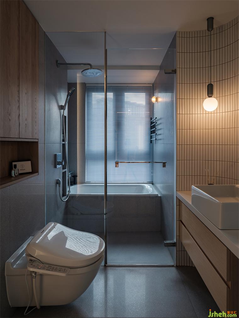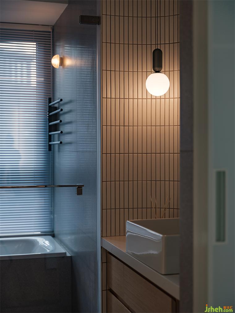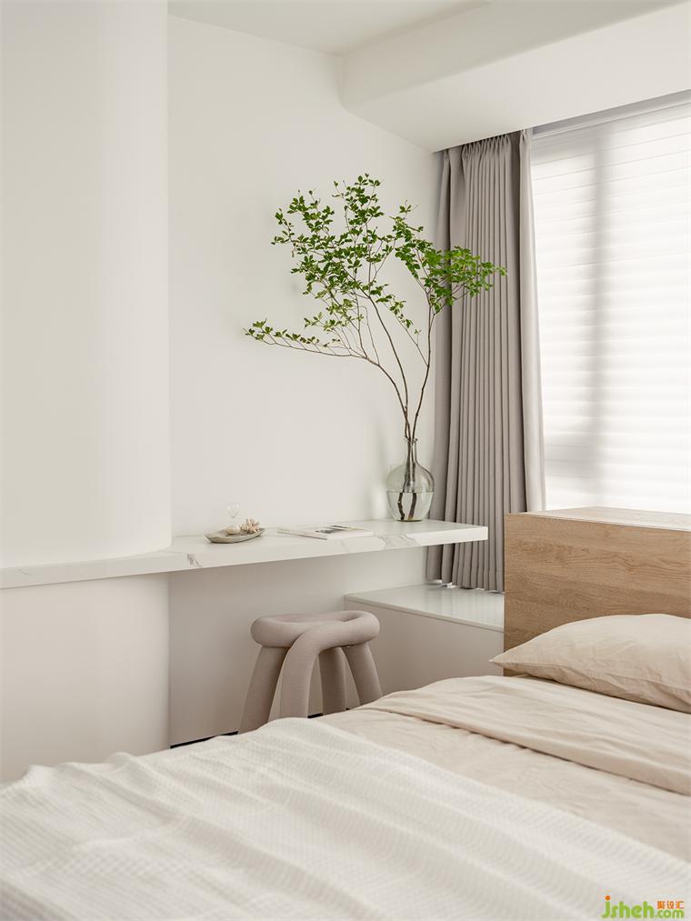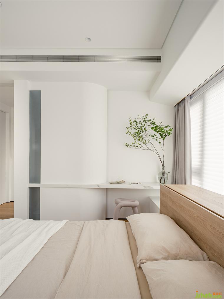 主衛(wèi)空間有限,但屋主希望能有較完善的沐浴與洗漱體驗(yàn),需求與空間雖有沖突,但這也間接引發(fā)了我們對透景與體塊穿插的想象。將面盆區(qū)向臥室拓展,與主臥梳化臺共構(gòu),裝修設(shè)計(jì)更為深切的連結(jié)了兩個(gè)空間,連接的弧線也柔和了空間形體。