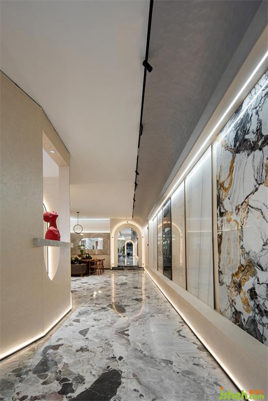 推門而入,入口處墻體被石材包裹著,線條的流動(dòng)性和秩序感豐富了空間層次,呈現(xiàn)出強(qiáng)烈的韻律感。紅色藝術(shù)裝置的運(yùn)用,柔和了石材的剛硬,也予以視覺醒目感。