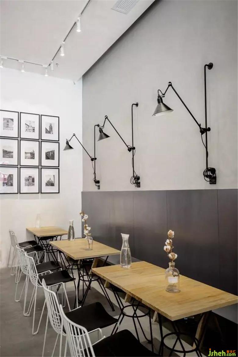 灰色的水泥板地面,白色刷漆的鐵藝和木色松木板混搭的餐桌椅,二者在燈光交織下的強(qiáng)烈對(duì)比,仿佛這座鋼筋混凝土的城市中流淌的一股暖流。