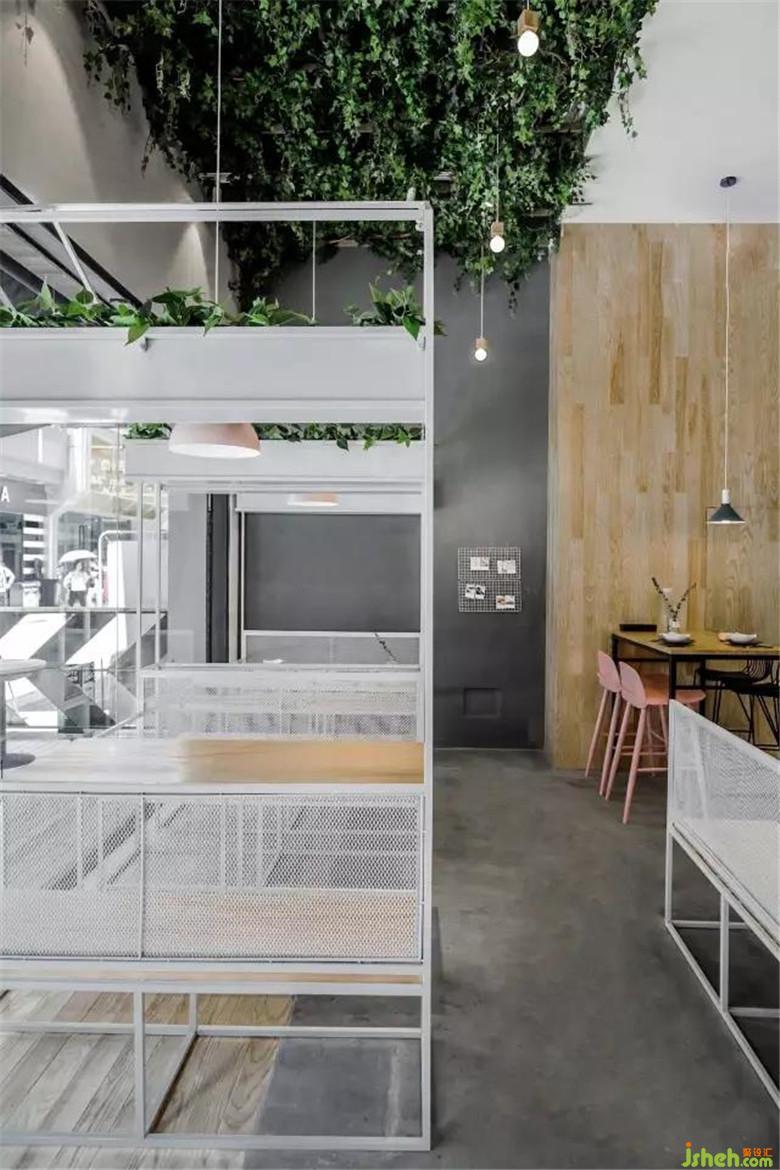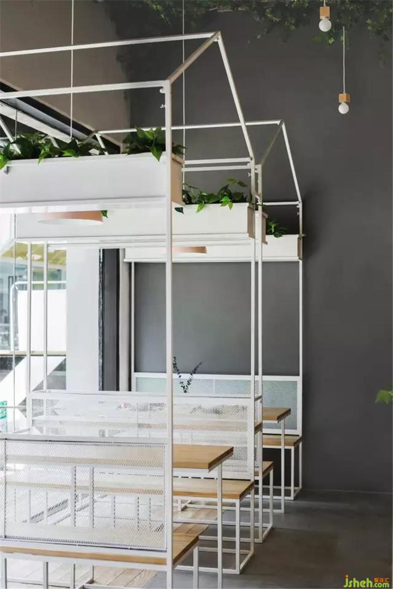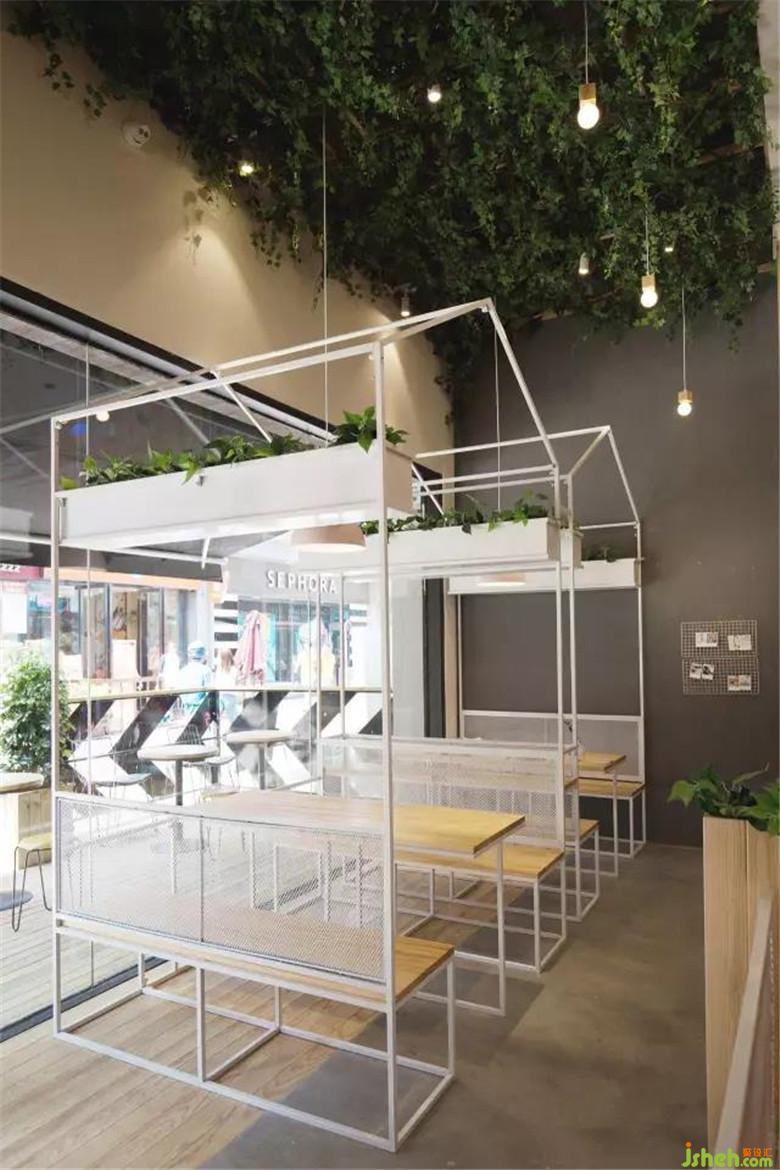 這是餐廳靠近入口處的一角,它由極具特色的鐵藝小房子結構組成,自成一體。天花上的綠植吊頂,就像朱麗葉故居中墻上的常春藤,是它們的存在見證了那對戀人。