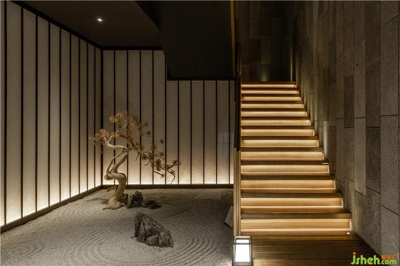 走廊上枯山水的沙石造景,增加了餐廳設(shè)計(jì)場(chǎng)景的庭院感,讓人不禁產(chǎn)生日式庭院的想象空間。