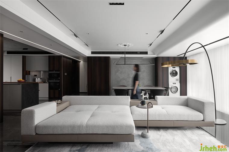 電視背景墻:下懸空中間留出電視凹槽,一路衍生至陽臺(tái)區(qū)域,采用墻板弧面倒圓過渡,視覺上隱形突出的梁體。