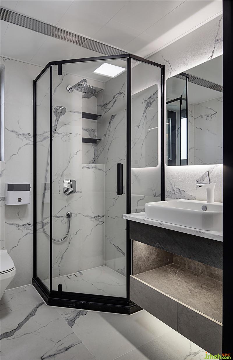 內(nèi)衛(wèi)是全爵士白大理石,配合墻面、頂面貫穿的線形燈,簡單之中彰顯不俗。AXOR的全透明龍頭和Kartell By Laufen的透明毛巾桿,雖然透明,卻成了最吸引人眼球的地方,讓人無法忽略其存在。