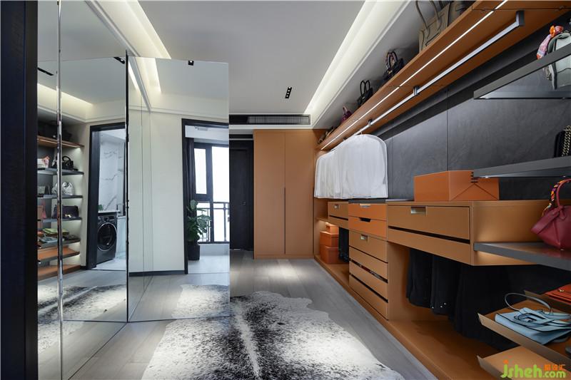 衣帽間的柜子是無側(cè)板支撐的掛墻系統(tǒng),雖然和傳統(tǒng)衣柜只是一塊側(cè)板的差別,但是給人帶來的驚艷感是很強的。黑與橙的搭配與之前黑白,白橙的搭配形成了色彩的遞進。