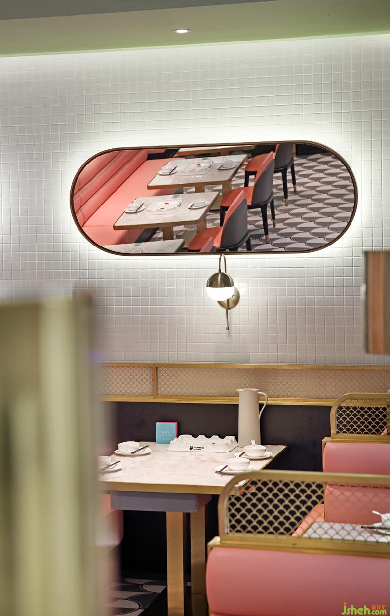 精巧的蕾絲圖案,流光閃爍的燈飾,在時(shí)髦的莫蘭迪綠色調(diào)中,營(yíng)造一種令人沉醉的溫柔氛圍。地面的魚(yú)鱗磚,訴說(shuō)著魚(yú)翔淺底的悠樂(lè),不受拘束的重色塊,強(qiáng)化空間的年輕個(gè)性。