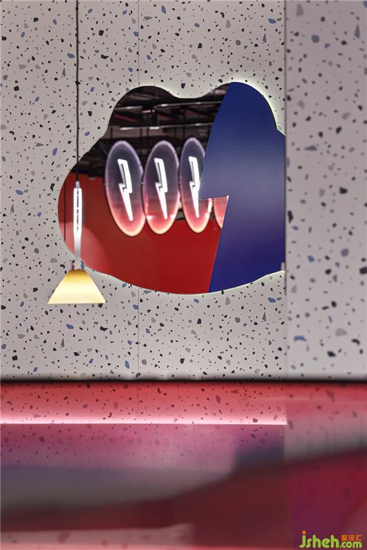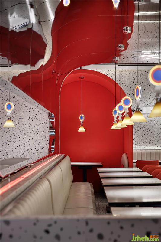 特別鮮明的鏡面反射區(qū)隔,分割不同的情緒空間,鏡面反射出迷幻色彩。一個(gè)烏托邦式的餐飲空間呼之欲出。