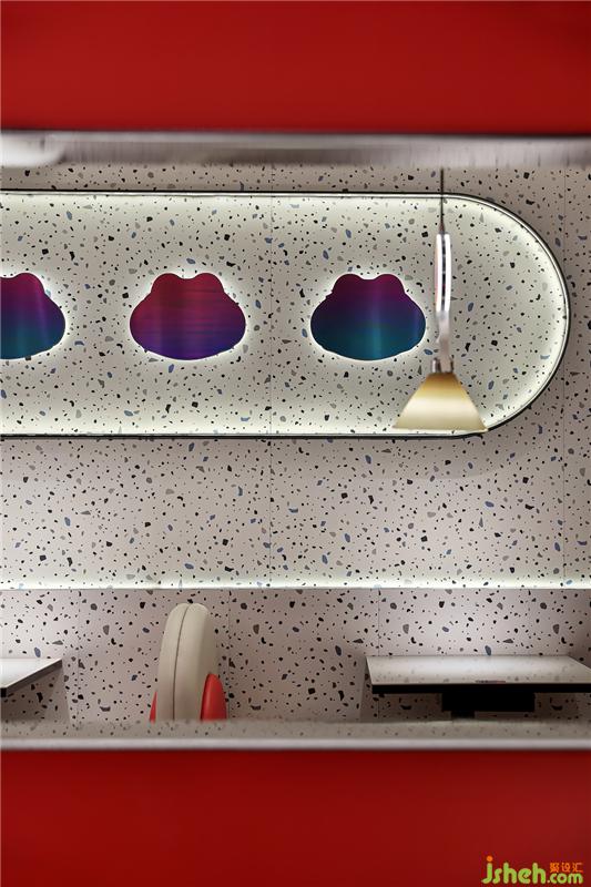 紅與藍(lán),奔放和感性,有如世界的繁蕪和簡(jiǎn)單,投射出復(fù)雜多變的情感。在本案餐廳設(shè)計(jì)中,墻面與地面運(yùn)用了大量復(fù)雜的不規(guī)則圖樣來代表繁雜的世界、繁雜的情緒。