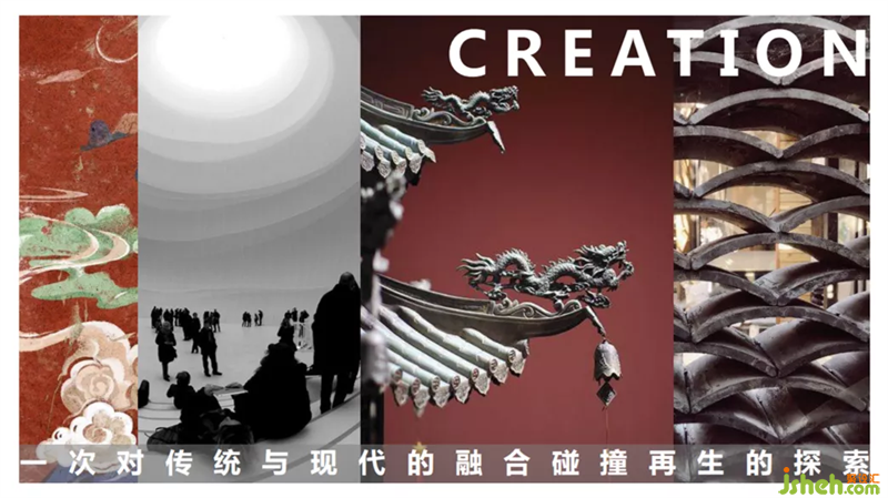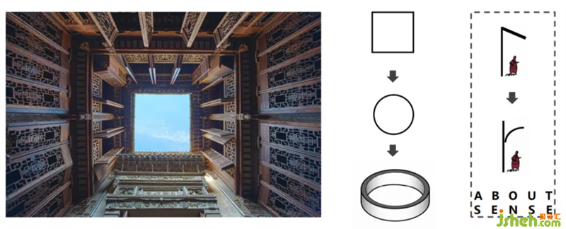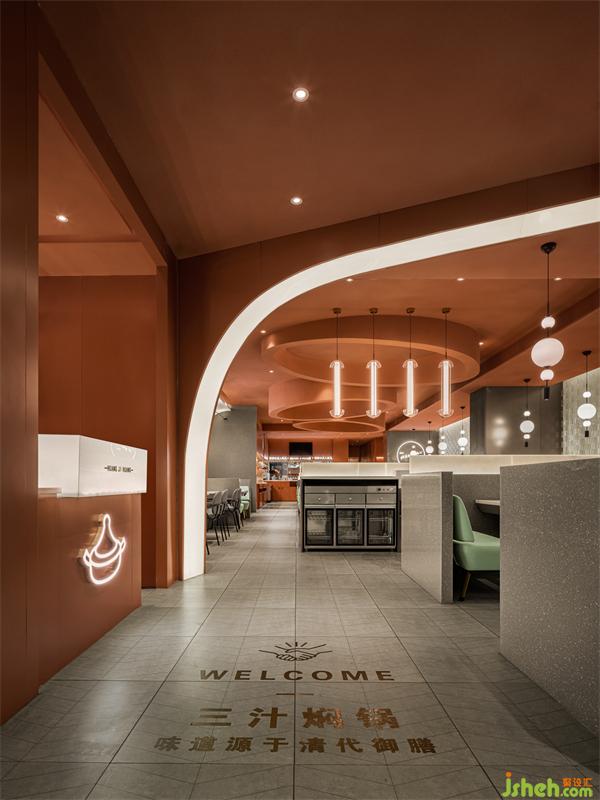 從拱門下從容步入內(nèi)城,天花上巨大的3口天井先聲奪人,圓形天井與室內(nèi)方正的平面布局融合,暗合天圓地方、天人合一的道家精神,也象征著黃記煌三汁燜鍋的中華文化內(nèi)蘊。