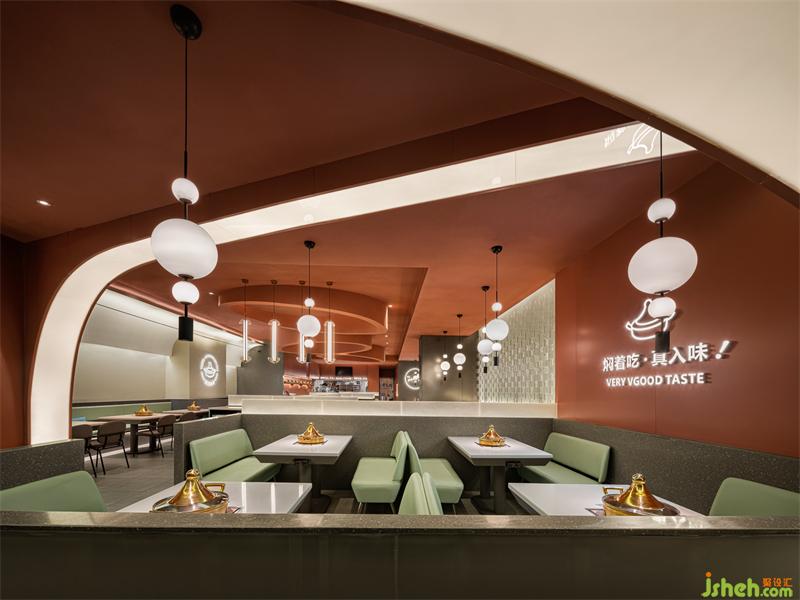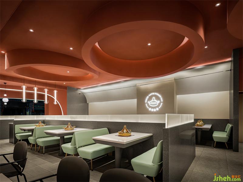 茶色天井營造出宮殿用餐氛圍,墻面造型是傳統(tǒng)屋檐的抽象賦形,呼應(yīng)著門頭的拱弧元素空間主色取自中國古建筑。大面積的茶色搭配練色,餐廳設(shè)計以銅綠為點綴,視覺上十分簡約。