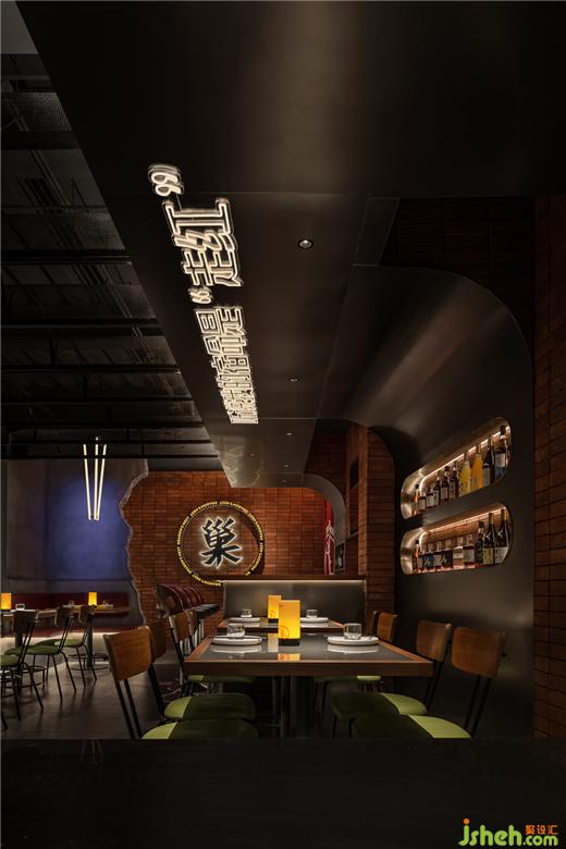 龍巢餐酒館設(shè)計師將專業(yè)的筆法,轉(zhuǎn)譯成弧線,材質(zhì),色彩等通俗易懂的形體語言,以更近人的通感,讓人沉浸,品味進(jìn)而植入印象。