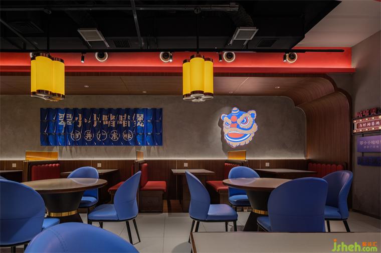 紅色,蘊(yùn)含現(xiàn)代廣東人喜愛(ài)的大吉利是、興旺發(fā)財(cái)?shù)暮貌暑^。藍(lán)色,嶺南建筑鐘情的淺淡基調(diào)。二者相互映襯,餐廳設(shè)計(jì)以冷暖對(duì)比強(qiáng)烈卻不違和的茄紅色和翠藍(lán)色成為空間主色調(diào)。