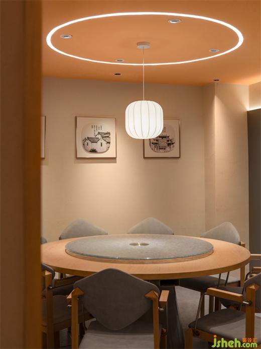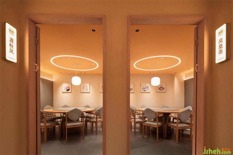 藤編主門、推拉式木隔門圍合起安靜的包間。餐廳設(shè)計(jì)仿牌匾形式標(biāo)語畫框“食在廣東,味在潮汕”和小幅方型科普畫懸掛于墻面,加之圓形發(fā)光燈帶、居于空間中心的圓桌,在方圓之間營(yíng)造暖心的景致和濃郁的相聚儀式感。