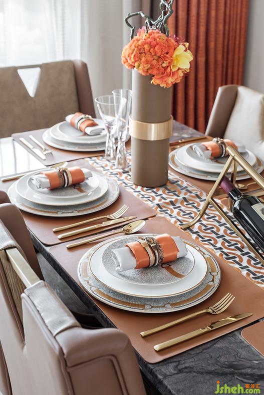 縱躍大開間的客餐廳擁有客觀的尺度感,愛馬仕橙色及金色配飾,則瞬間讓整個氛圍活躍起來。設計發(fā)揮空間優(yōu)勢,通過合理而巧妙的手法劃分功能區(qū)間,結合精致得體的配飾,讓明媚的陽光得以在空間里隨意跳躍,自由翩躚流淌,為居者提供體貼舒適的居家時光。