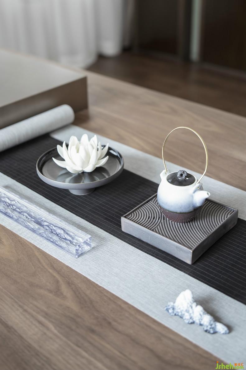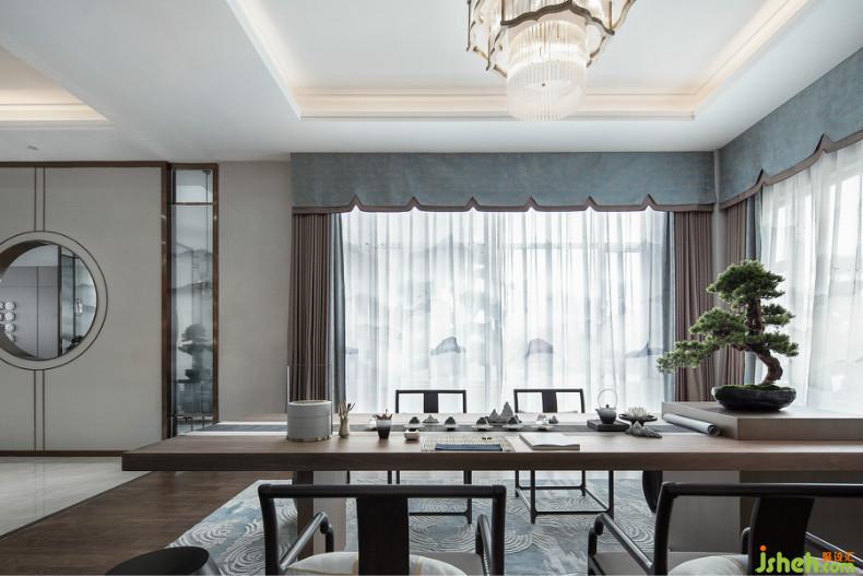 “茶者,南方之嘉木也。” 簡潔雅致的茶室空間,室內(nèi)設(shè)計師設(shè)計中延續(xù)山水視覺,以灰階淡彩登堂。窗簾山水淡墨色點綴流線山水畫,清泉煮清茶,人在這里,消磨一盞茶的時光,歲月靜好。