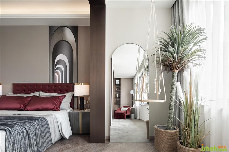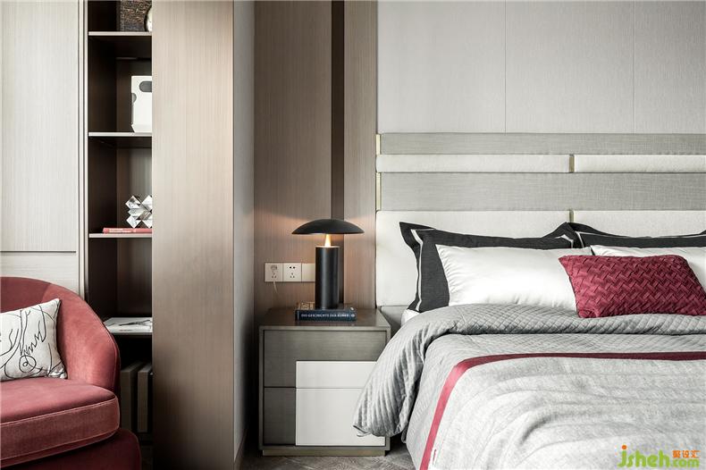 臥室的設(shè)計延續(xù)了客廳的用意,從墻體到軟裝,淡色調(diào)為主,樣板房設(shè)計不同灰度的色塊組合拼接,搭配酒紅色的布藝,格外醒目,精細車線工藝以及絲滑的材質(zhì)盡顯雍容大氣。