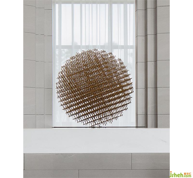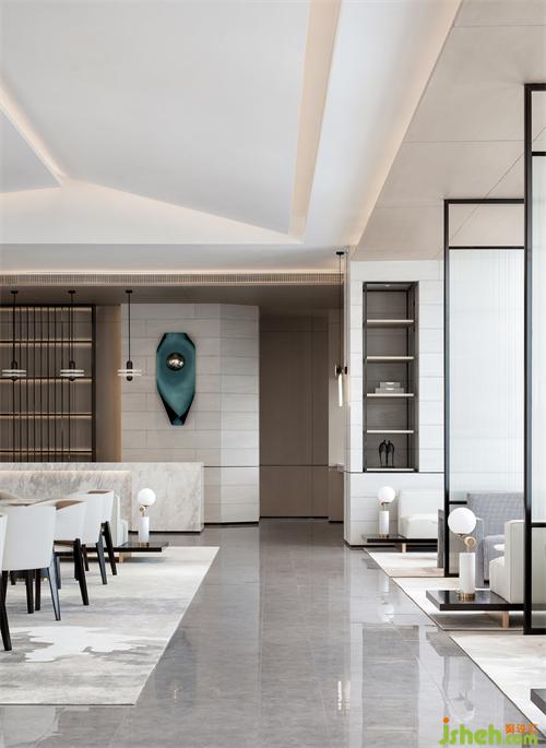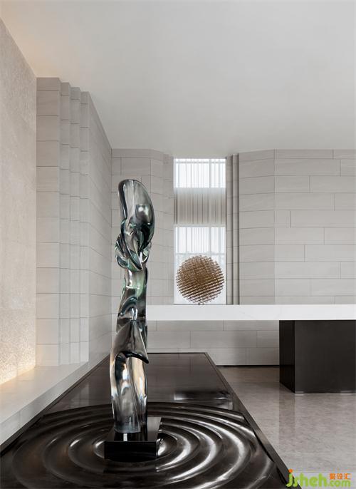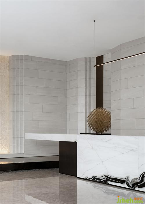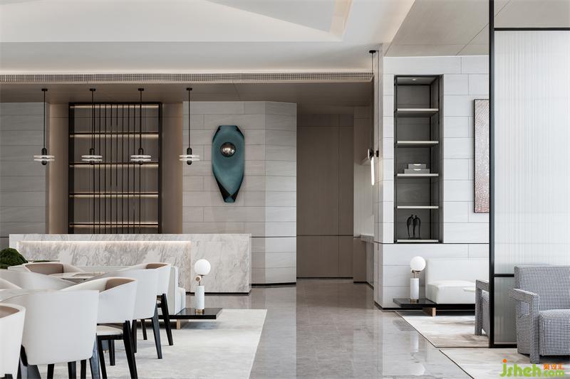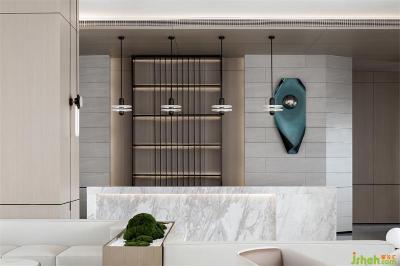 純粹的空間,泛著淡淡的雅致,石材以干凈利落的切角分面,透出現(xiàn)代的塊面設(shè)計(jì)手法。墨綠色的金屬掛飾,個(gè)性而時(shí)尚,彰顯空間的高級(jí)藝術(shù)感。