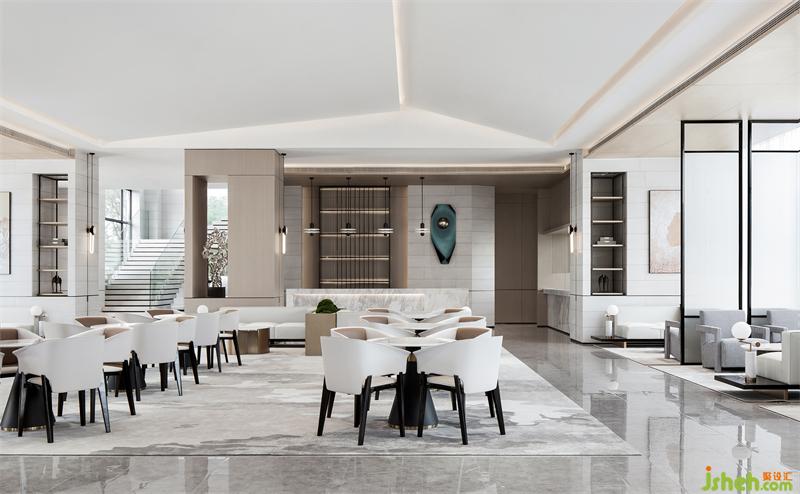 大塊面的錯(cuò)落斜頂天花將不平衡動(dòng)態(tài)觀感極致呈現(xiàn), 以現(xiàn)代方式重構(gòu)傳統(tǒng)秩序美, 光線提煉天花塊面輪廓南寧售樓處設(shè)計(jì),將傳統(tǒng)的意向表現(xiàn)得深入細(xì)膩。洽談區(qū)的休閑椅簡潔輕巧,和天花相得益彰。