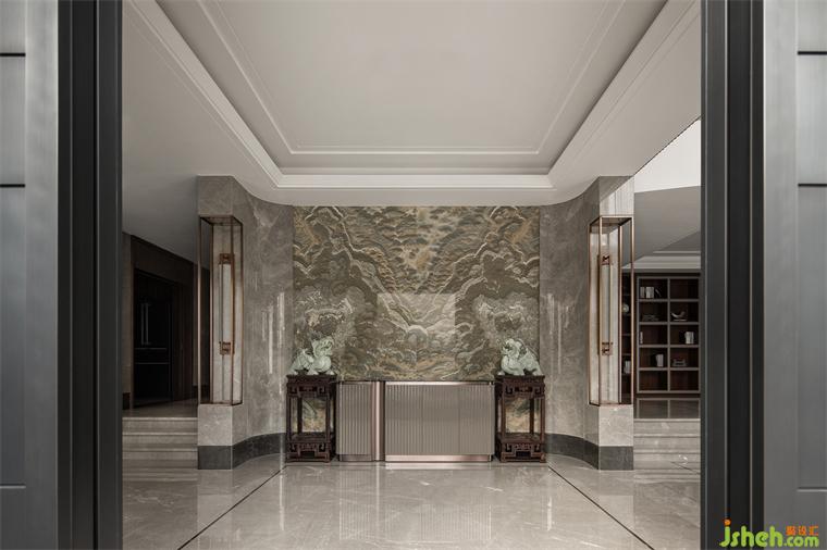 近似龍形的吊頂磚畫盤旋空中,古樸角幾上的瑞獸貔貅擺件,花園別墅裝修設(shè)計(jì)框定空間端莊大氣的主基調(diào),營(yíng)造出底蘊(yùn)深厚的東方文化獨(dú)有的韻致,再以雅致淺灰飾面作底,簡(jiǎn)練純粹的線條平衡了現(xiàn)代金屬的冷硬鋒利。