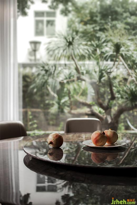 一層中餐廳靜享庭院的自然風(fēng)光,視野開闊,大理石圓桌與啞灰色餐椅的軟飾搭配與光影互補(bǔ)共生。