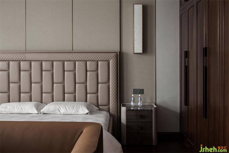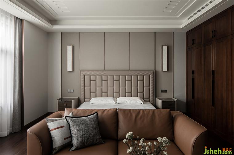 臥室延續(xù)整體空間的風(fēng)格,灰色與米色的中性背景色鋪陳空間層次,以床為中心延伸成組合套系,駝色沙發(fā)、淺白臺(tái)燈、暖調(diào)實(shí)木,賦予空間靜謐安寧的理性基調(diào)。