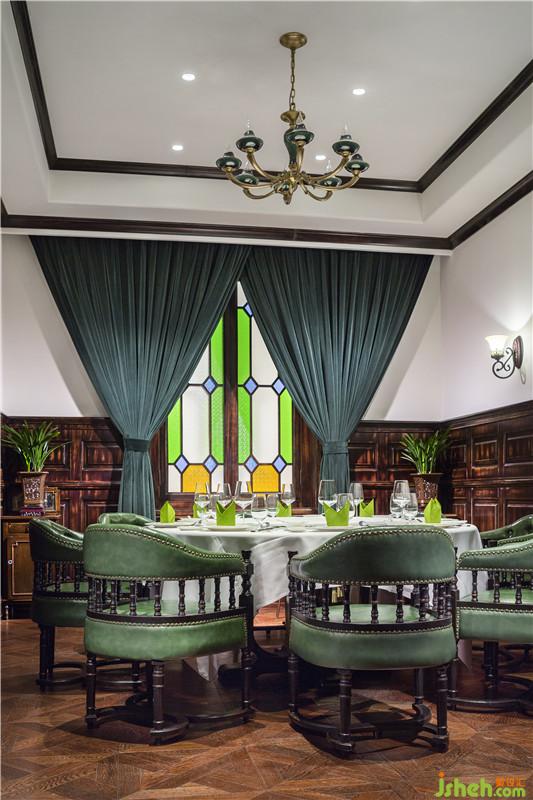 孔雀綠色的窗簾似于綠色的椅子相呼應(yīng),對(duì)稱的窗格花紋,將用餐的儀式感烘托而出。