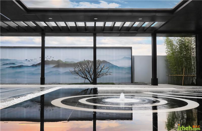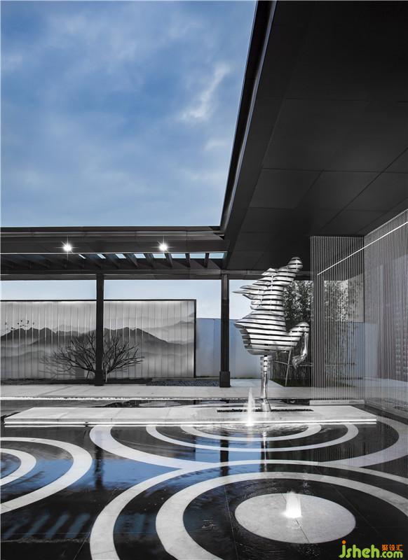空間布局分為三個(gè)部分,分別是前院、中庭、以及后院,整個(gè)空間均以水墨江山之態(tài)貫穿著整個(gè)背景,如有浩然之氣、氣海山水蓄意待發(fā),遂尋白馬之軀來(lái)立其為本命之物,將此意此境匯于此景中,可謂是賦予其意了。前廳塑玄關(guān)庭院為場(chǎng)境背景,馬軀以鋼材層層羅列而成,引水柱漣漪之流為馬體之血脈,水體循環(huán)不斷,如隱如現(xiàn)、欲奔而躍,賦予其生生不息之態(tài)。