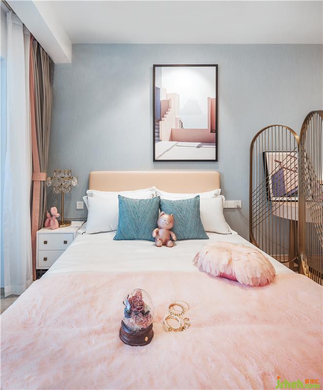 大面積的色塊避免了空間的艷俗平衡了色彩關(guān)系淺藍(lán)色與粉紅色的互相襯托增添了空間的層次感和少女的清新氣質(zhì)。樣板房設(shè)計(jì)