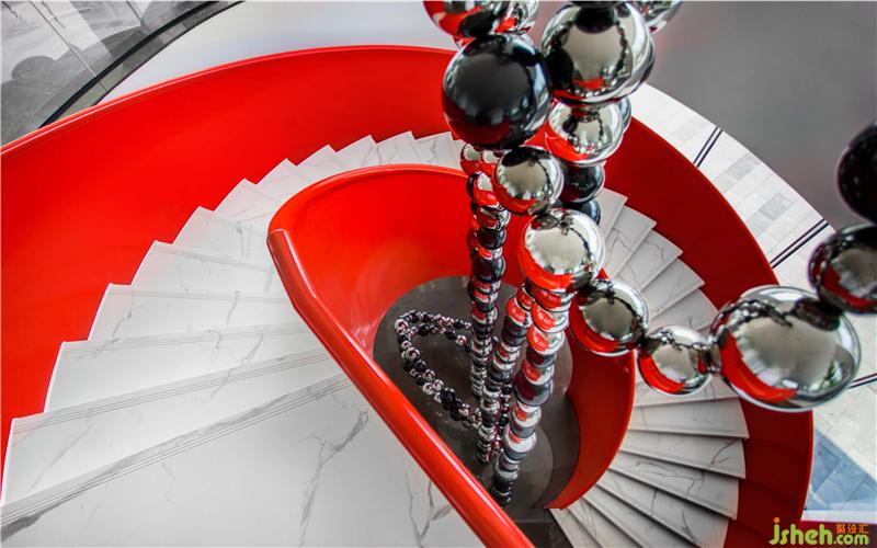 越過冰山浪尖后,紅色旋轉(zhuǎn)樓梯連接了二層空間,在垂直空間上,注以喜劇感和沖擊感的視覺符號,漫步于此,優(yōu)雅從容,讓行走以也變成一種藝術(shù)美。裝修設(shè)計