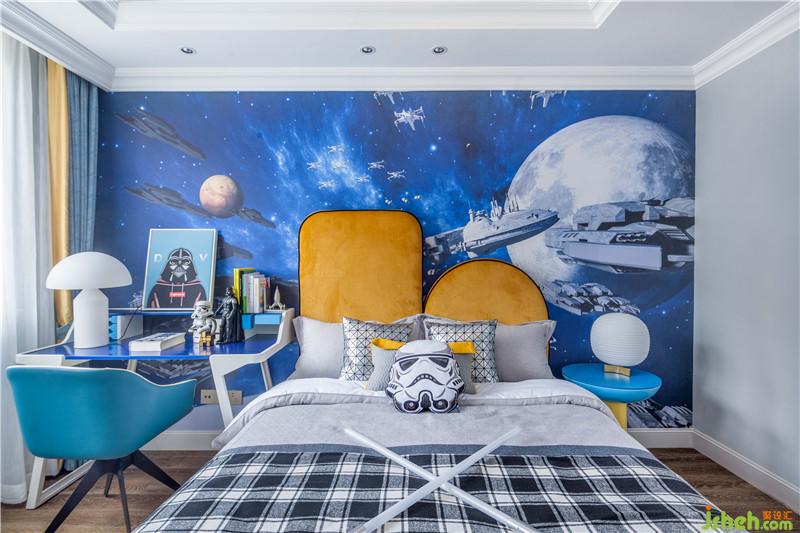 相較于其他空間,兒童房的設(shè)計(jì)充滿了活力與想象,外太空壁紙掛滿整個(gè)墻面,與各種科幻元素的結(jié)合,讓孩子沉浸在自由想象的世界當(dāng)中。
