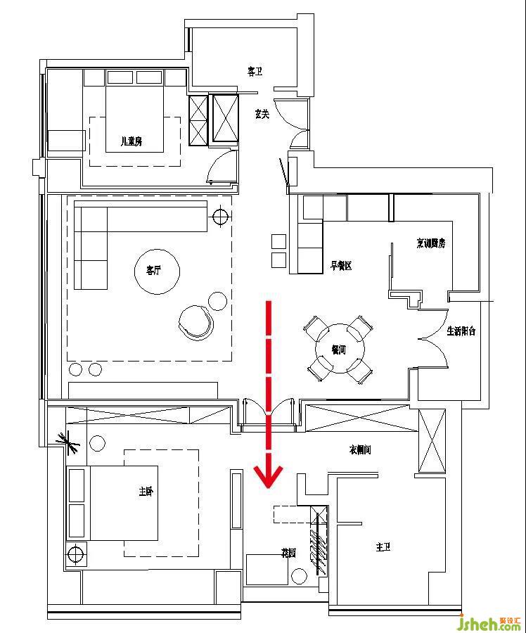 4. 主臥內(nèi)私密性較低,房主安全感。隨后依據(jù)以上問(wèn)題進(jìn)行再規(guī)劃設(shè)計(jì)