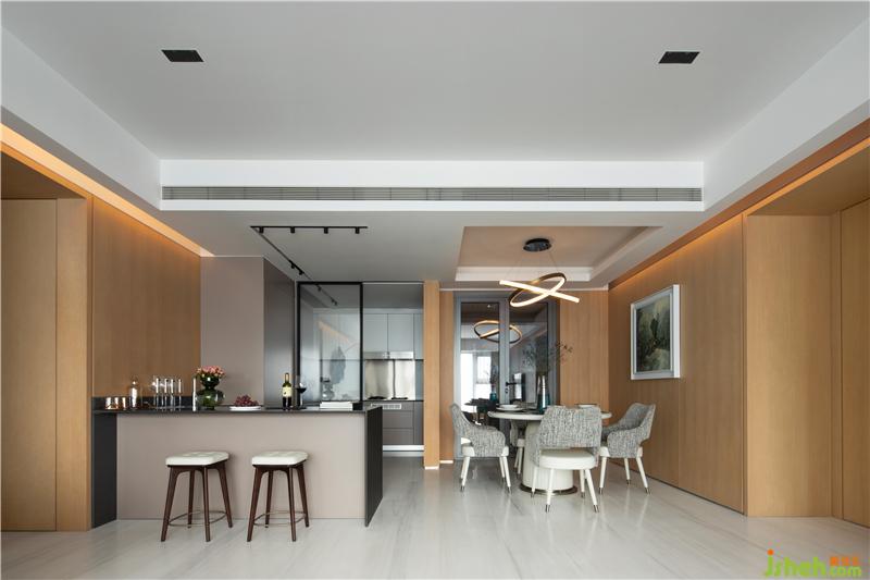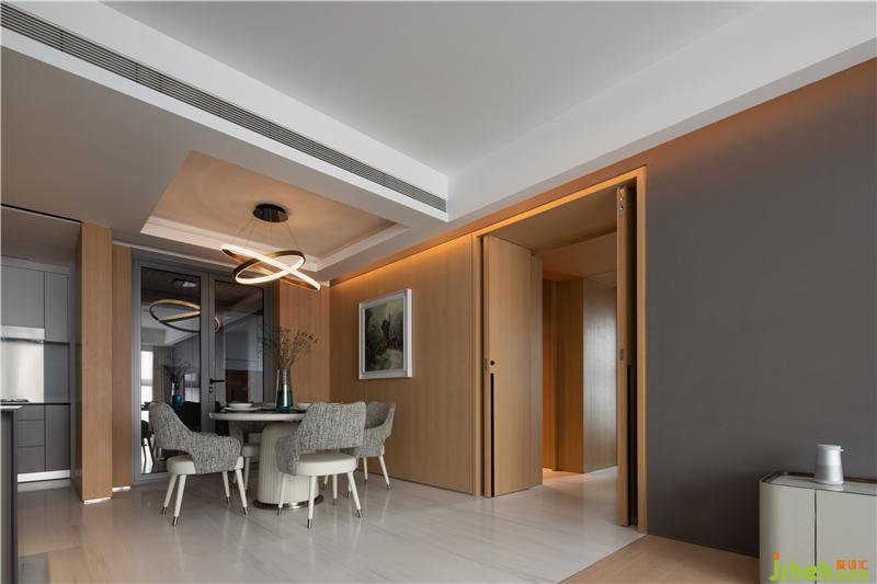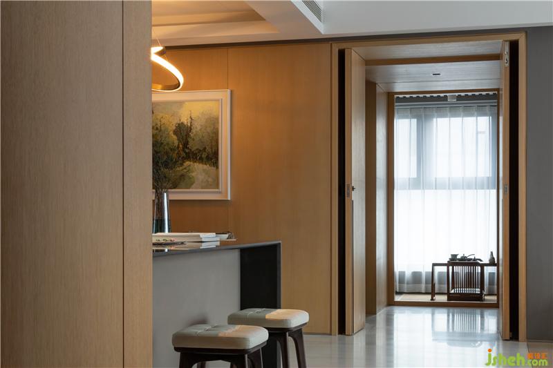 在入門處,從電梯廳走出,可發(fā)現(xiàn)鞋架與空間渾然一體,豪宅設(shè)計(jì)師特意地將鞋架抬高,便于房主進(jìn)出門脫換。人為地將鞋柜木飾面與墻面統(tǒng)一,簡(jiǎn)雅而不失格調(diào)。
