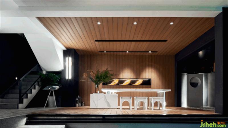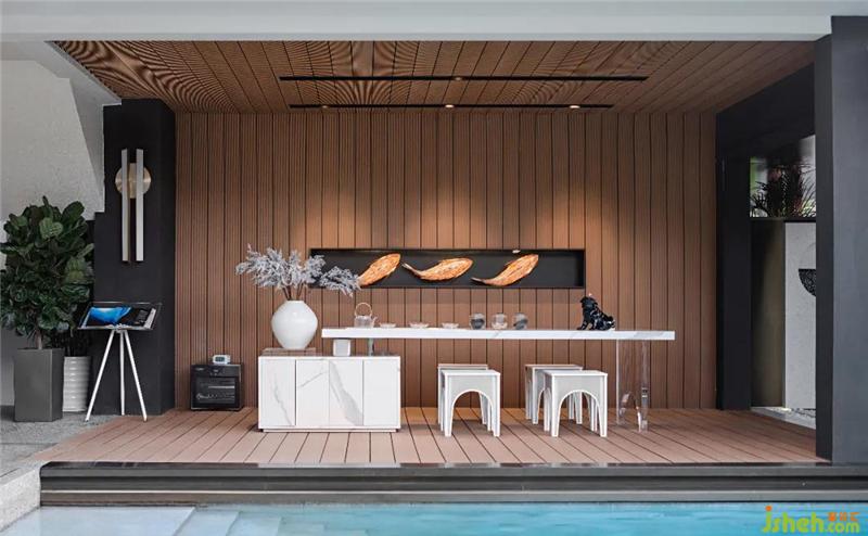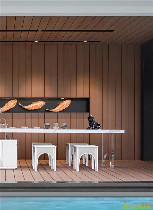 中國禮序講究幾進幾出,我們不希望所有人就像進菜園門一樣隨隨便便就進來,而是要通過這樣的一個儀式感的狀態(tài),從側面來到我們主空間。我們還設計了一個很大的超尺度的這樣的一個泳池,不同于別墅型的泳池,我們把絕大多數空間留給泳池以及可以做派對、餐飲的地方。原本大的尺度減小了,小的尺度放大了,打造出別樣的生活方式。這是比較大的驚喜。