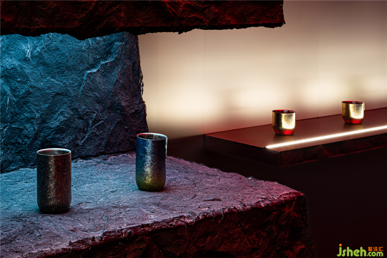 燈光渲染下,絢麗光潔的鈦杯陳列在礦洞石壁上,如同開采后裸露的鈦礦。展廳設(shè)計(jì)空間賦予藝術(shù)潛能和商業(yè)邏輯,而鈦金屬本身的礦物屬性又再次鞏固了這一設(shè)計(jì)敘事,消費(fèi)者進(jìn)入后便成為探洞者,探索和游逛結(jié)合,完成一次由城市進(jìn)入自然,由現(xiàn)代回望遠(yuǎn)古的非凡體驗(yàn)。