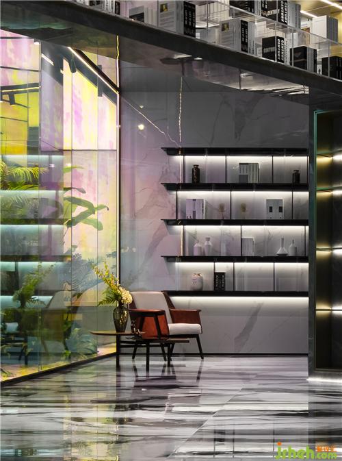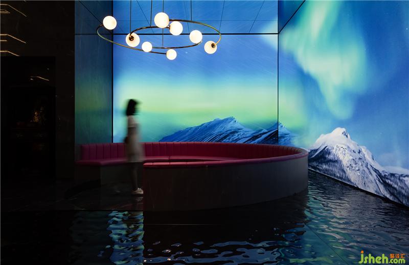 入口休閑區(qū)穿插著多媒體的形式以呈現(xiàn)最佳的展示效果,借助這種方式,讓客戶在虛擬場景空間中慢慢享受科技帶來的全新感受。漫步其中,伴隨輕柔音樂律動(dòng)而產(chǎn)生迷離虛幻的動(dòng)感畫面,虛擬的極光映襯在水面上,在空間中融合科技元素,創(chuàng)造出獨(dú)特的沉浸式場景體驗(yàn),勾引人們對未知世界的探索欲望??偛空箯d設(shè)計(jì)